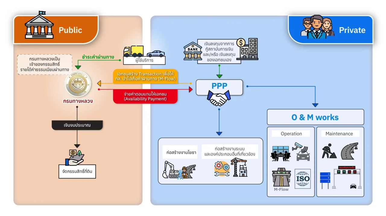 - ภาครัฐเป็นเจ้าของกรรมสิทธิ์ทรัพย์สินที่เอกชนได้ลงทุนก่อสร้าง และรายได้ค่าธรรมเนียมผ่านทาง